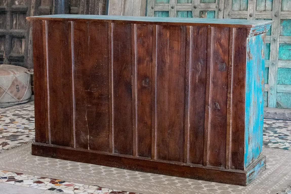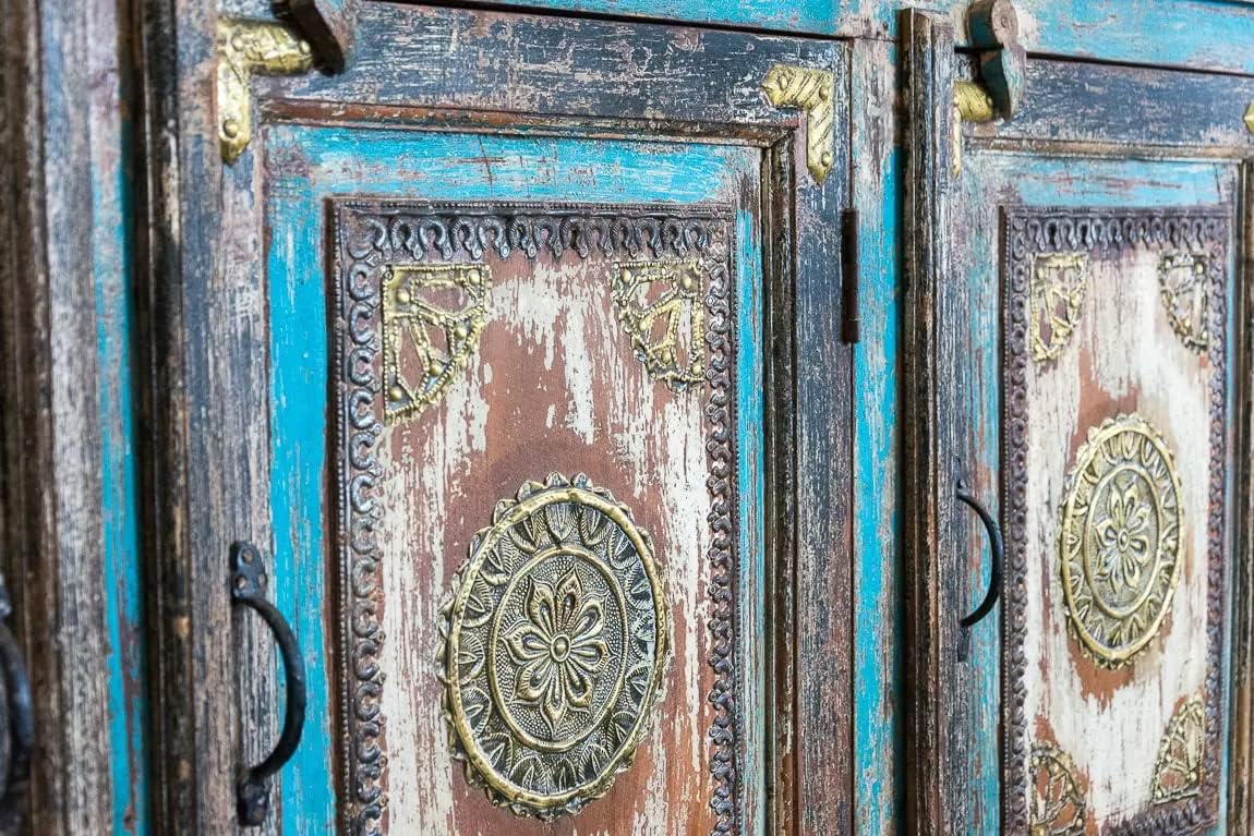 Antique Indian Brass Work Hand Carved Solid Wooden Sideboard Bluewash Mango Wood Indian Arched Sideboard Cabinet Storage Units Indian Solid Wood Finish,Living Room Bedroom Furniture,Modern Sideboard