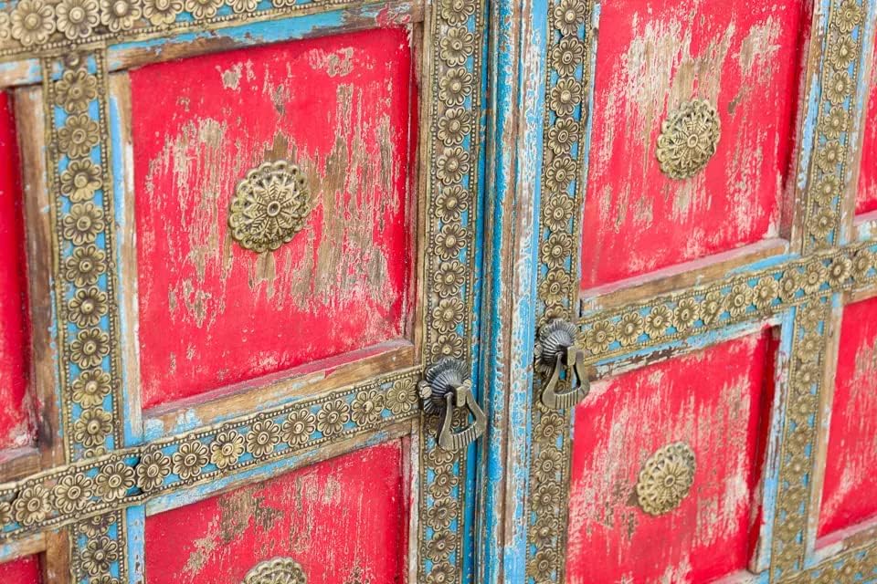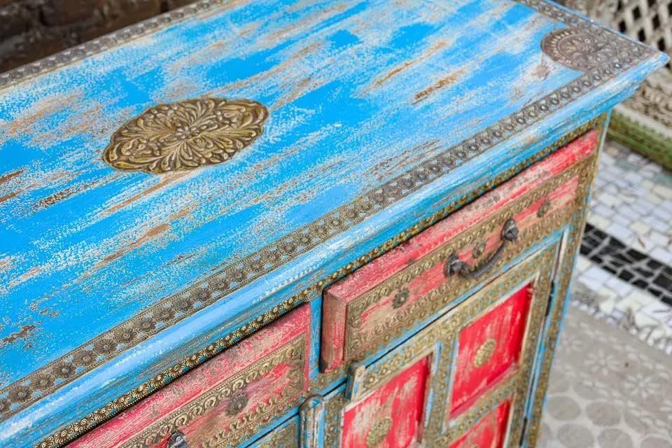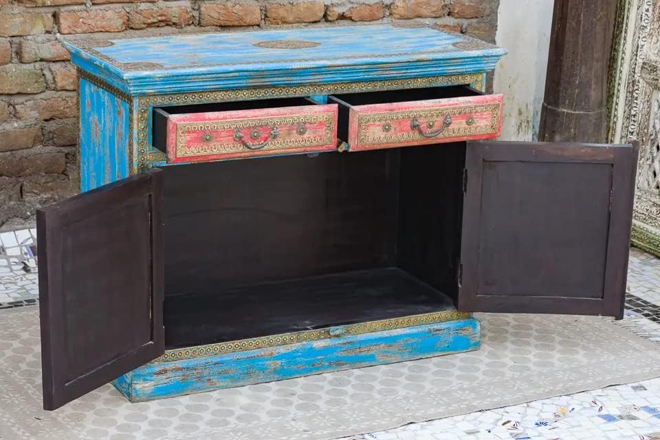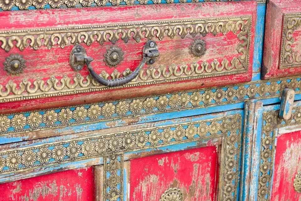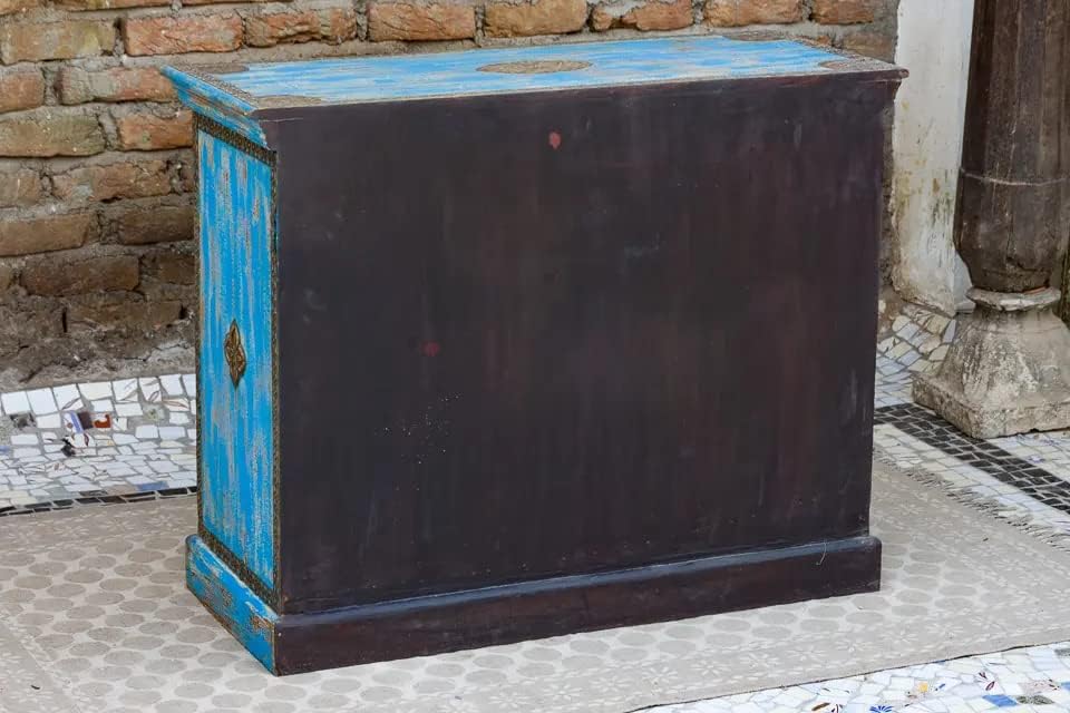 Antique Indian Brass Work Hand Carved Solid Wooden Sideboard Bluewash Mango Wood Indian Arched Sideboard Cabinet Storage Units Indian Solid Wood Finish,Living Room Bedroom Furniture,Modern Sideboard