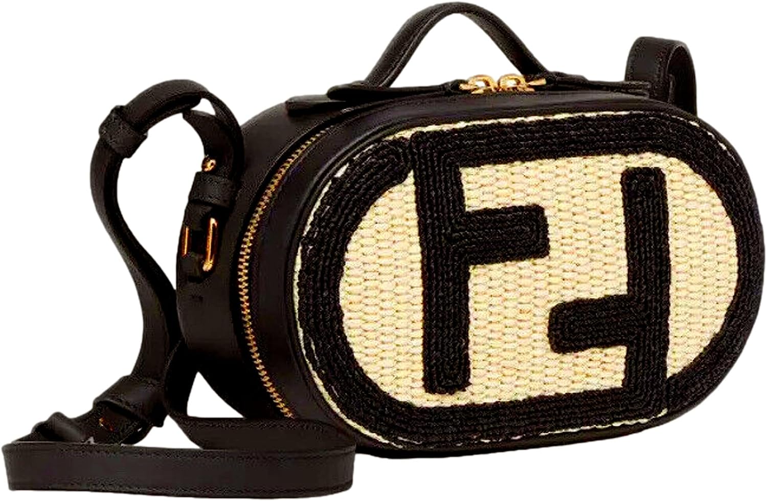 Model Number: 8BS059 Hand-Woven Raffia in Natural Tone & Black. Black Calfskin Leather. Woven FF Motif. Gold-Tone Hardware. Zipper Closure. Beige Canvas Interior Lining. 1 External Back Pocket.